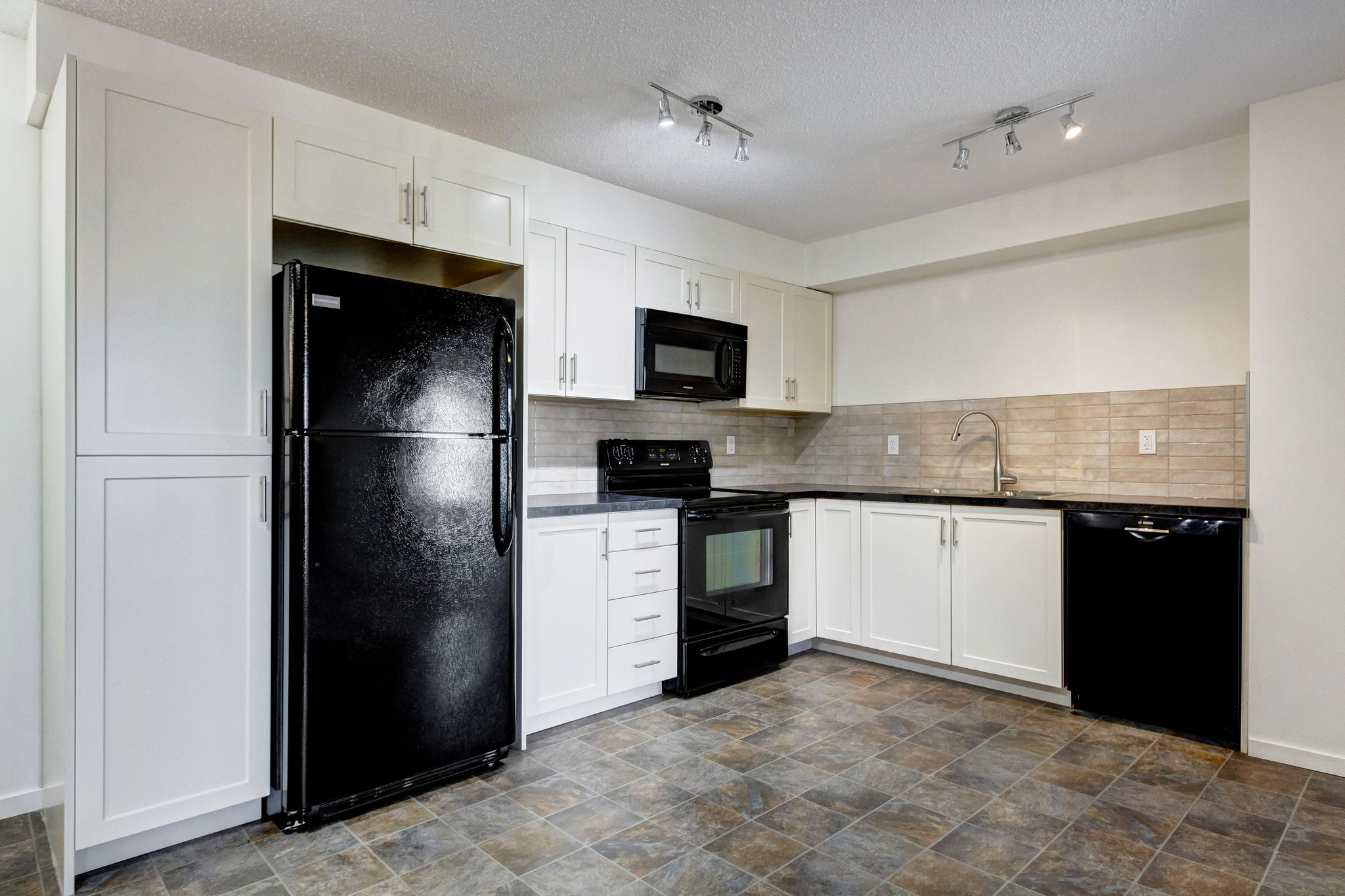 Step into a thoughtfully designed floorplan offering 841 square feet of open-concept living. The kitchen features clean cabinetry, sleek black appliances, a tiled backsplash, and plenty of counter space for cooking, meal prep, or entertaining.